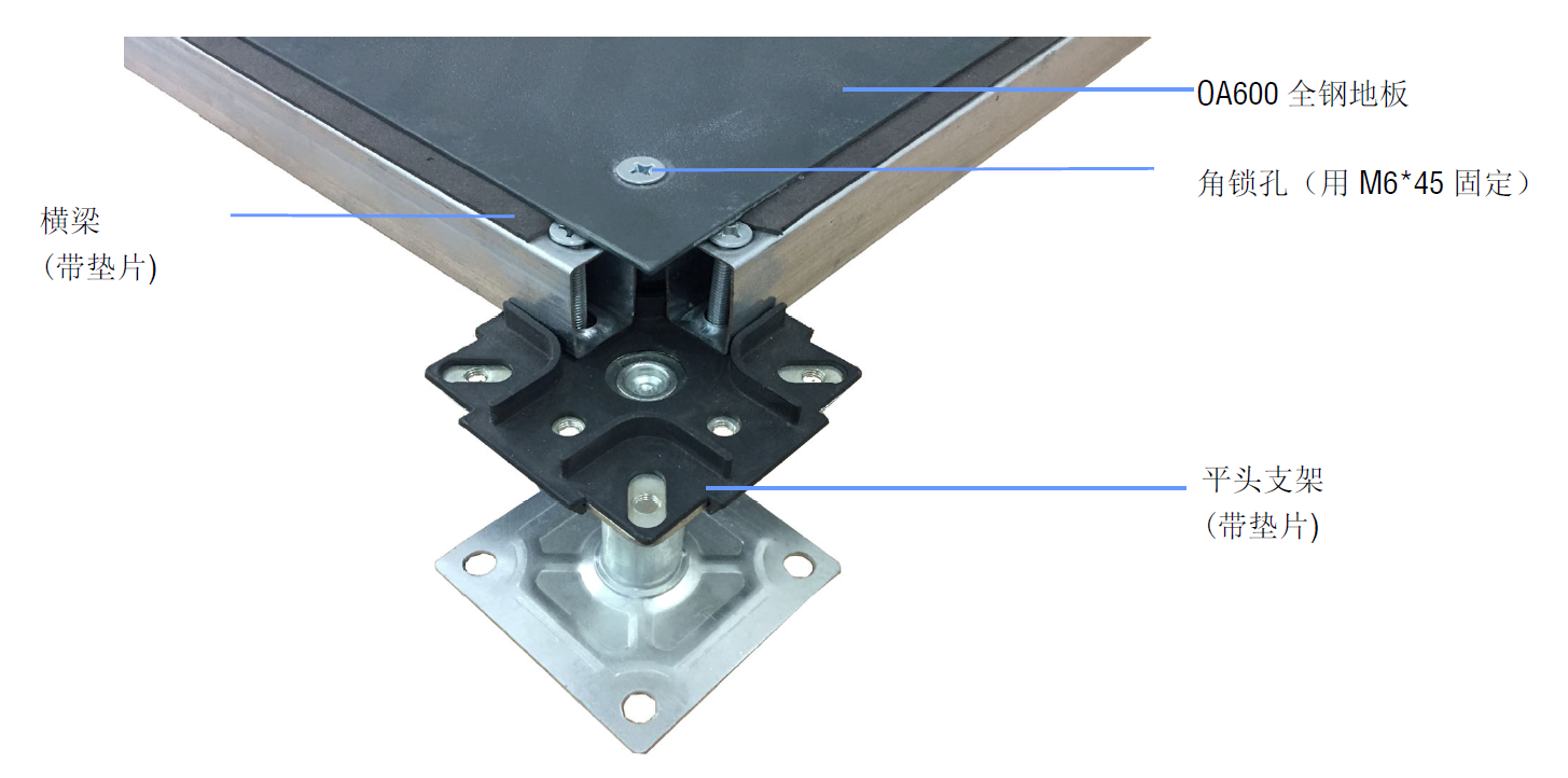 带横梁的全钢OA600网络地板性能稳定,承载高,变形小,使用寿命长,噪音小,平整度高,板面有角锁孔固定到支架上,边板搭到横梁上。要求高的高端写字楼,人流量搭的境外赌场布线地板经常使用该款地板。最高承载可以做到FS2000~FS3000.